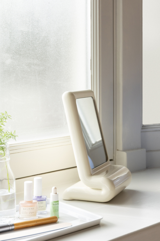 "Met zijn robuuste, snoepachtige vorm en speelse rondingen is deze spiegel zowel lief als opvallend. Hij weerspiegelt de kenmerkende designtaal van &K en combineert zachtheid en statement in één compact geheel. Het handzame formaat maakt hem perfect voor dagelijks gebruik, of hij nu op een badkamerplankje of op een nachtkastje staat."